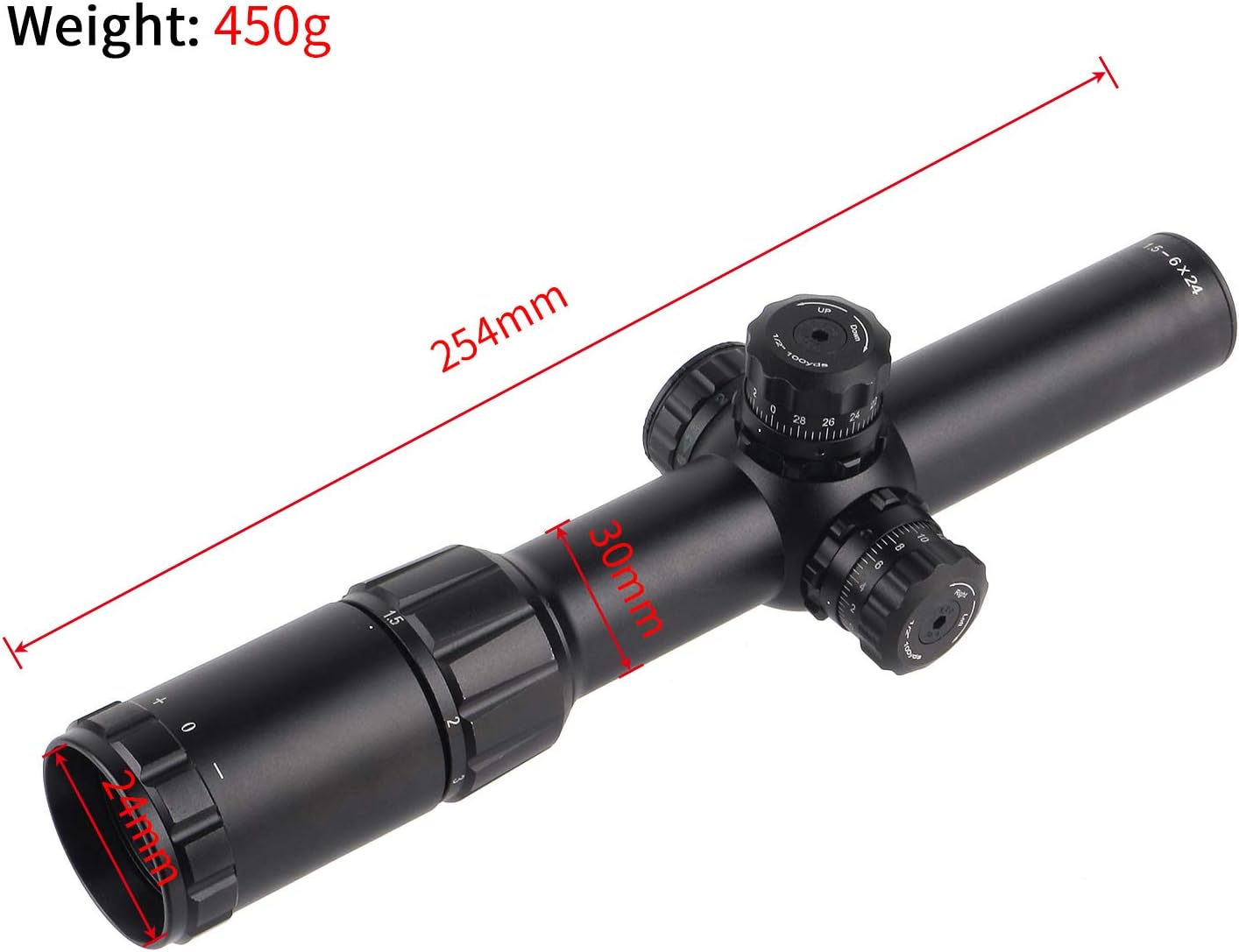 | Included Components | 1x 1.5-6X24E scope, 2x flip-up lens covers, 2x 20mm Picatinny scope rings, 2x 11mm dovetail scope rings, 1x wrench, 1x lens cloth |