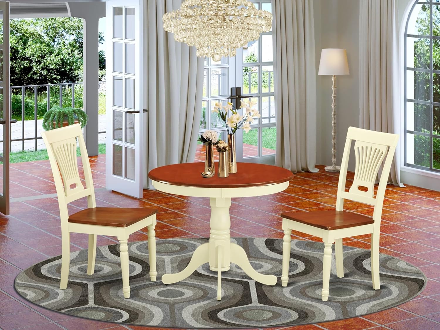 EAST WEST FURNITURE - ANPL3-WHI-W - 3-PIECE DINING TABLE SETThis exceptional round kitchen table is designed to impart an impression of dining elegance to both traditional and contemporary decor. This kitchen set will add a wonderful dose of beauty to your dining room. The stunning 3-piece Traditional dining table set emphasizes its curves and details, giving an otherwise conventional set a modern twist. The body of these unique wooden dining chairs and the round kitchen table are crafted from Premium Quality Asian wood (Rubber Wood), providing excellent sturdiness and stability to these dining room chairs and dining table. The modern sturdy hardwood structure, comfortable wooden seat, and Panel Back, and reliable wood dining table offer a cutting-edge look to your kitchen, fantastic stability to this fantastic dining room table set, and comfortable support to your back. Thanks to its exceptional proportions, this Kitchen dining table set is extremely easy to carry, clean, assemble and move to different locations. The classic styles of this special pedestal dining table set blend seamlessly with any home decor, and the smooth wooden seat and Panel Back of these wooden dining chairs will keep customers comfortable.FEATURES:Seat: WoodenModern Dining Table Color: Cherry and ButtermilkDining Chairs Color: ButtermilkChairs for Dining Room Dimensions: Length: 22; Width: 18; Height: 37.Modern Dining Table Dimensions: Length: 36; Width: 36; Height: 29.5.Includes: 2 Kitchen Dining Chairs and 1 Round Wooden Dining Table