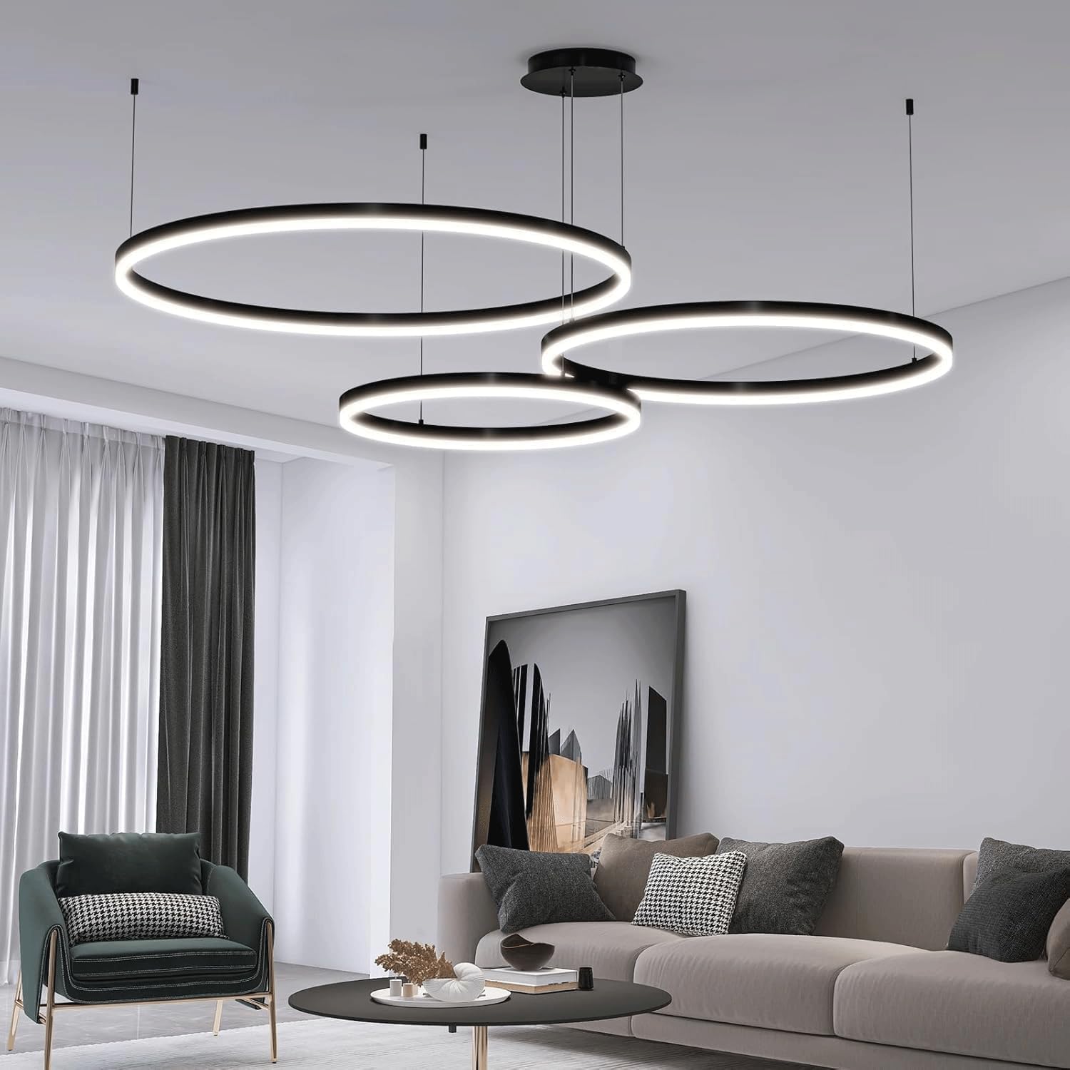 Type: LED ChandelierMaterial: acrylic + aluminum alloyPower: 70WLight source: LEDVoltage: 110-240VIrradiation area: 10㎡-15㎡Style: modern Color: blackApplicable space: living room, balcony, bedroom, clothing store, corridor.1* Chandelier1* Remote control (without batteries)1* Installation accessories