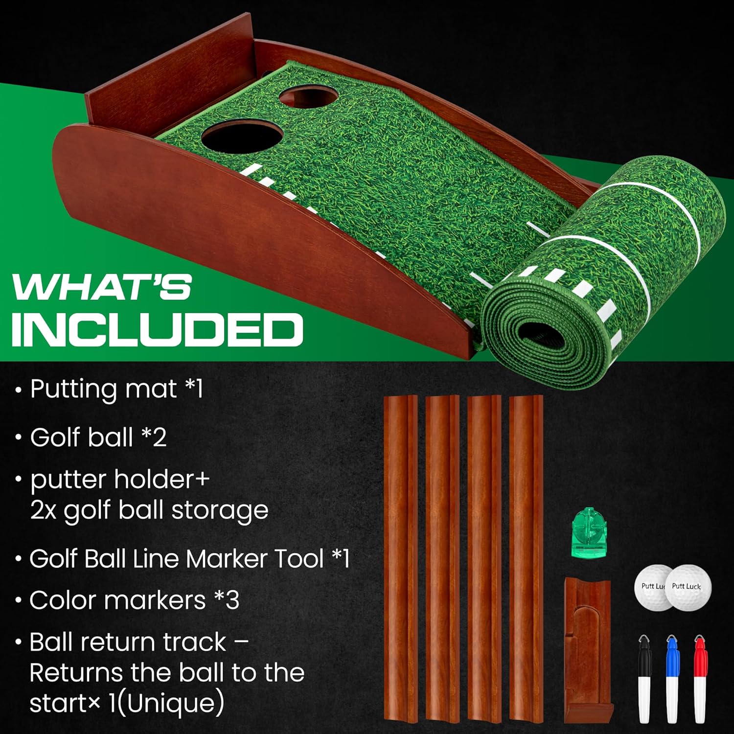 | Included Components | Ball Holders, Golf Balls, Markers, Putting Mat, Wooden Ball Return |