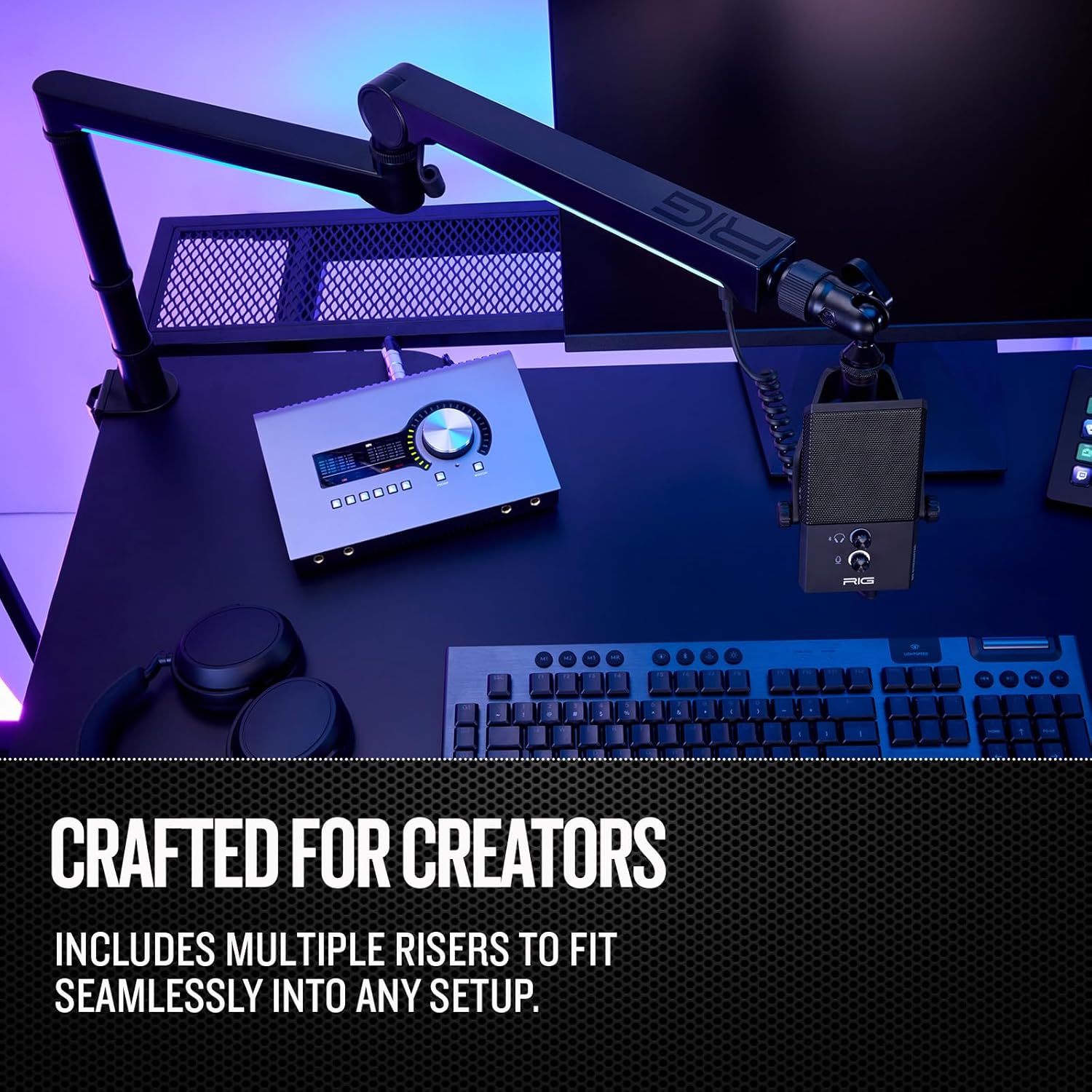 The RIG MA-1 Low Profile USB Mic Arm brings studio-grade precision to any creator’s recording setup. Designed for the RIG M2 STREAMSTAR PRO HD microphone and compatible with any USB microphone via 1/4, 3/8 and 5/8-inch mounts, the MA-1 allows creators to take complete control of their content. Record or stream in comfort thanks to MA-1’s customizable design. Utilize the low-profile setup to fit underneath monitors and stay out of your line of sight. Multiple risers are included so you can position your microphone at the perfect height above your setup to avoid keyboards, mice, and other items in your recording space. Make fine-tuned adjustments with 360-degree arm rotation and adjustable ball head attachment which offers perfect placement to ensure optimal voice pickup during every recording session. Easy setup process allows for quick installation, with the included desk clamp expandable up to 105mm to fit almost any desk. Built-in USB-C and USB-A ports with power passthrough ensure instant cable management. Customizable RGB underlighting brings a personal flair to recording sessions. Creators can choose from 11 dynamic and static color options.